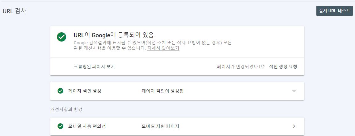 가장 쉽고 빠른 방법으로 구글 검색엔진에 “site:”과 내 페이지 URL을 직접 입력해 보는 것입니다.