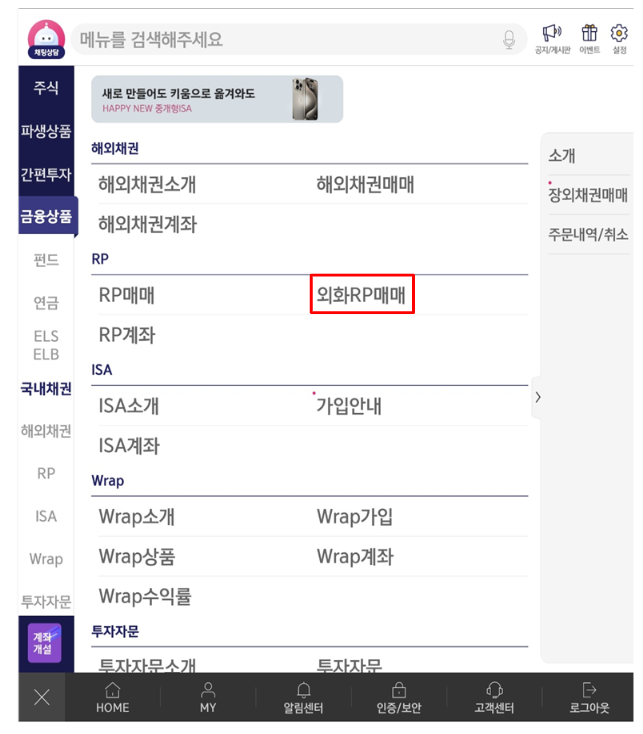 외화 RP 매수는 영운문S#의 메뉴 > 금융상품 > RP > 외화 RP 메뉴를 선택합니다.