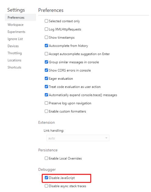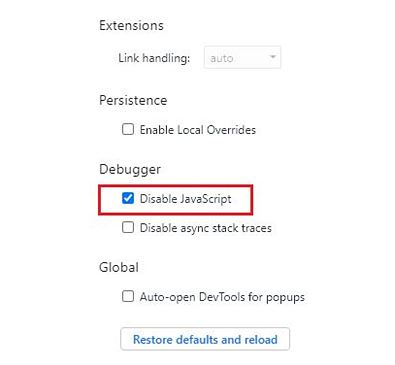 크롬에서 마우스 오른쪽이 잠겨있는 페이지에서 키보드 "F12"키를 눌러줍니다. 그리고 키보드 "F1"키를 눌르거나 톱니바퀴 모양의 설정을 누르면 후 아래로 스크롤하시면 Debugger라는 항목이 나타납니다.