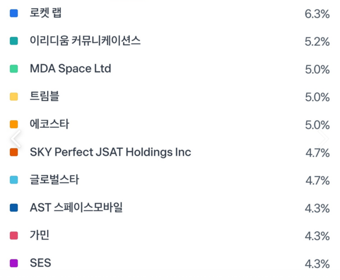 ProcureAM에서 S-Network Space Index 지수를 추종합니다. 글로벌 우주 항공 기업들의 시가총액 및 성과 등으로 구성된 것입니다.