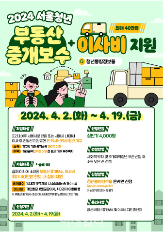 서울시가 학업·구직 등으로 이사가 잦은 청년(19~39세)들을 위해 부동산 중개보수비와 이사비를 1인당 최대 40만원까지 지원한다. 시는 이달 4000명, 오는 8월 2000명 등 올해 총 6000명에게 중개·이사비를 지원할 예정입니다.