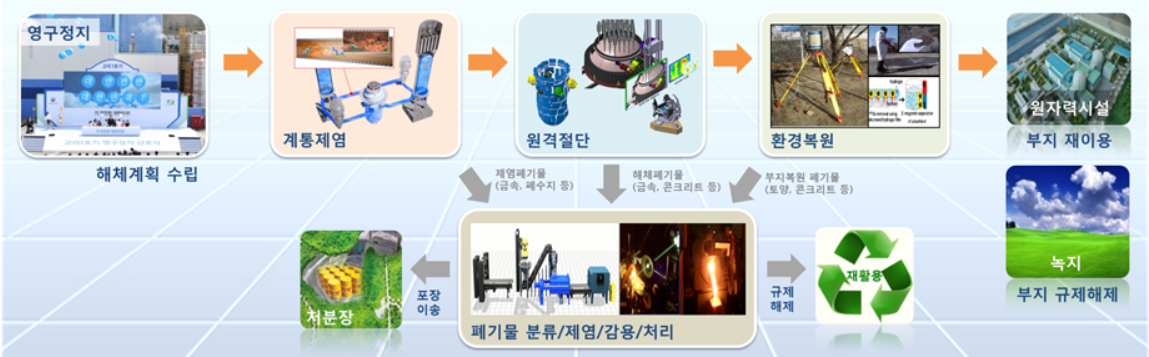 사용후핵연료 냉각 및 반출 → 제염·해체 → 비방사성시설 철거 → 폐기물처리시설 구축 → 방사성시설 철거 → 부지 복원 순으로 진행