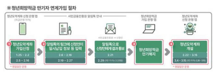청년희망적금 만기 예정자는 1월 25일부터 2월(다음 달) 16일까지 4주간 11개 은행 앱을 통해 비대면으로 연계 가입을 신청할 수 있다. 만기 수령금을 청년도약계좌에 일시 납입할 수 있도록 하고, 정부 기여금도 일시에 매칭해 자산 형성 효과 볼 수 있다. (최소 200만원부터 만기 수령금 전액까지 가능) 금융당국은 일시납입금에 대한 정부기여금도 일시 지급할 방침이다. 기여금은 월 설정금액과 개인 소득 등에 따라 책정되며 월 한도는 2만 1000원~2만 4000원