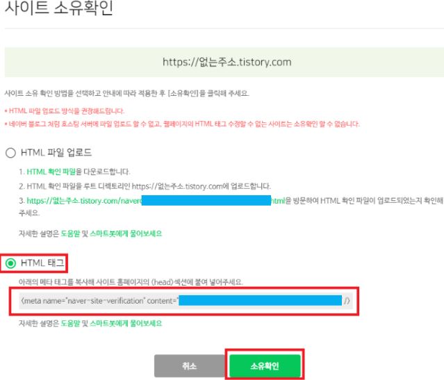 ❍ 블로그 주소를 입력하면 '사이트 소유확인'페이지가 열리는데 아래 "HTML태그"를 선택하고 아래 표시된 메타태그를 복사합니다. 아직은 '소유확인' 버튼을 누르지 마세요.