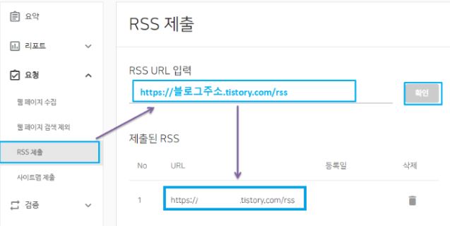 ❍ 좌측의 'RSS제출'클릭하면 빈칸에 내 블로그 주소에 RSS를 붙여서 입력합니다.