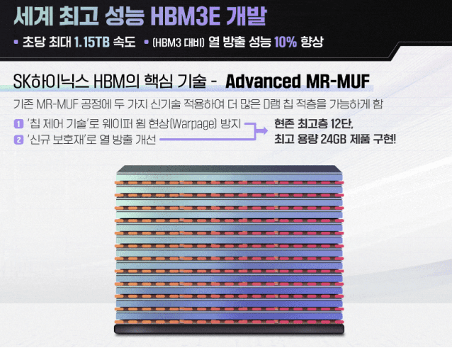 기존 HBM3 8층 짜리와 현재 나온 HBM3 12층 적층의 큰 차이점은 8층은 MR-MUF 12층은 (Advanced) MR-MUF 라